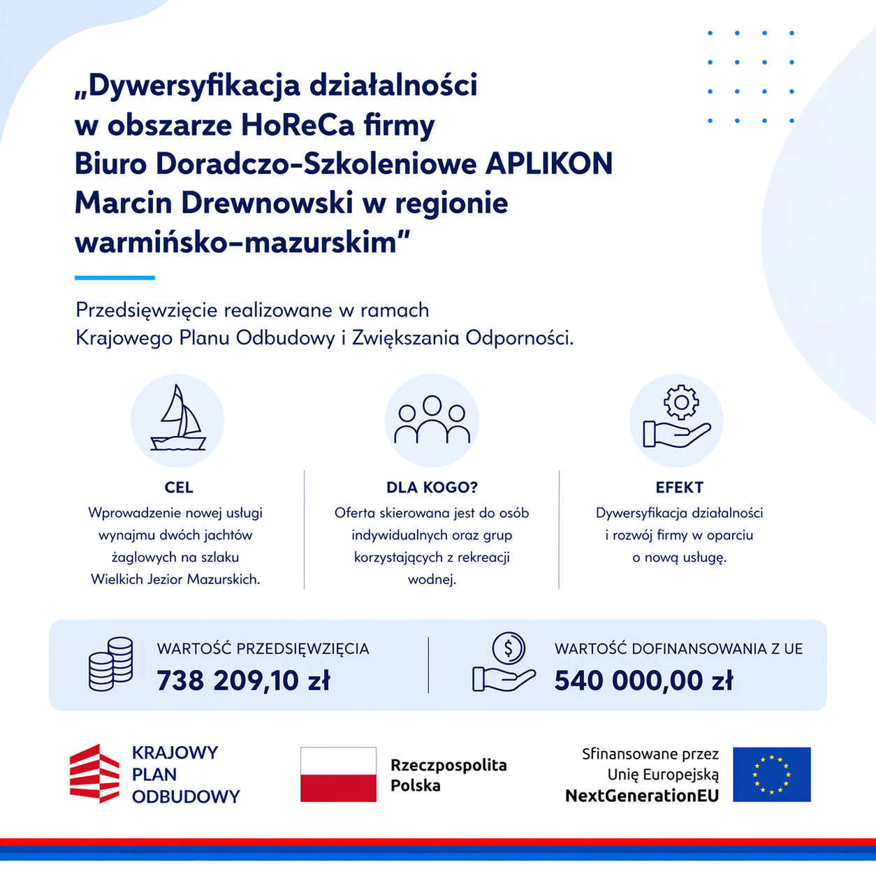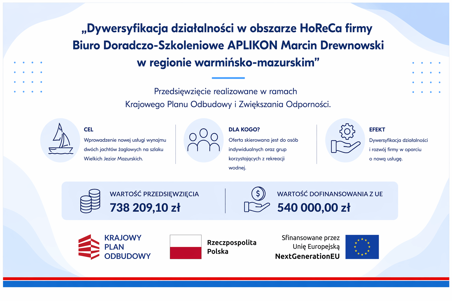Tytuł przedsięwzięcia: „Dywersyfikacja działalności w obszarze HoReCa firmy Biuro Doradczo-Szkoleniowe APLIKON Marcin Drewnowski w regionie warmińsko–mazurskim” w ramach Krajowego Planu Odbudowy i Zwiększania Odporności, inwestycja A1.2.1. Inwestycje dla przedsiębiorstw w produkty, usługi i kompetencje pracowników oraz kadry związane z dywersyfikacją działalności.